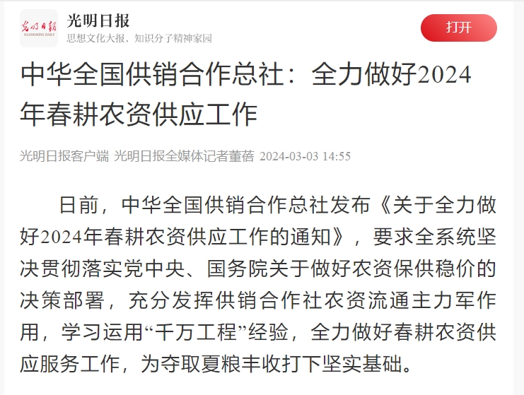 日前,中華全國供銷合作總社發(fā)布《關于全力做好2024年春耕農(nóng)資供應工作的通知》,要求全系統(tǒng)堅決貫徹落實黨中央、國務院關于做好農(nóng)資保供穩(wěn)價的決策部署,充分發(fā)揮供銷合作社農(nóng)資流通主力軍作用,學習運用“千萬工程”經(jīng)驗,全力做好春耕農(nóng)資供應服務工作,為奪取夏糧豐收打下堅實基礎。