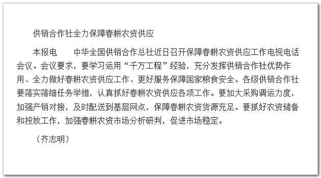中華全國(guó)供銷(xiāo)合作總社近日召開(kāi)保障春耕農(nóng)資供應(yīng)工作電視電話會(huì)議。會(huì)議要求,要學(xué)習(xí)運(yùn)用“千萬(wàn)工程”經(jīng)驗(yàn),充分發(fā)揮供銷(xiāo)合作社優(yōu)勢(shì)作用、全力做好春耕農(nóng)資供應(yīng)工作、更好服務(wù)保障國(guó)家糧食安全。各級(jí)供銷(xiāo)合作社要落實(shí)落細(xì)任務(wù)舉措,認(rèn)真抓好春耕農(nóng)資供應(yīng)各項(xiàng)工作。要加大采購(gòu)調(diào)運(yùn)力度,加強(qiáng)產(chǎn)銷(xiāo)對(duì)接,及時(shí)配送到基層網(wǎng)點(diǎn),保障春耕農(nóng)資貨源充足。要抓好農(nóng)資儲(chǔ)備和投放工作,加強(qiáng)春耕農(nóng)資市場(chǎng)分析研判,促進(jìn)市場(chǎng)穩(wěn)定。